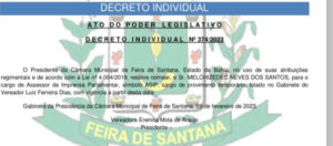 Publicado no último dia 09 de Fevereiro no Diário Oficial da Câmara Municipal de Feira de Santana a nomeação do Jornalista Melchizedec Neves dos Santos para o cargo de Assessor de Imprensa Parlamentar, lotado no Gabinete do Vereador Luiz da Feira.
