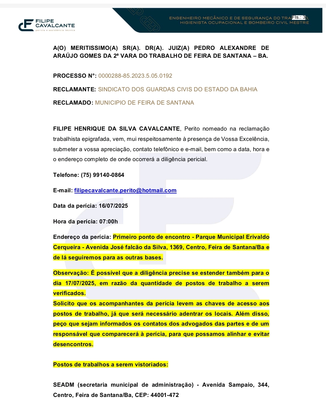 A perícia está agendada para o dia 16 de julho de 2025, às 7h da manhã, com ponto de partida no Parque Municipal Erivaldo Cerqueira. O trabalho será conduzido pelo perito nomeado Filipe Henrique da Silva Cavalcante, podendo se estender até o dia seguinte (17/07), caso a demanda exija. Estão na lista de inspeção técnica as seguintes unidades: Secretaria Municipal de Administração (SEADM), Base Avançada da Matriz, Departamento de Veículos da Prefeitura, Centro de Atendimento ao Feirense (CEAF) e a Base Avançada do Centro de Abastecimento.