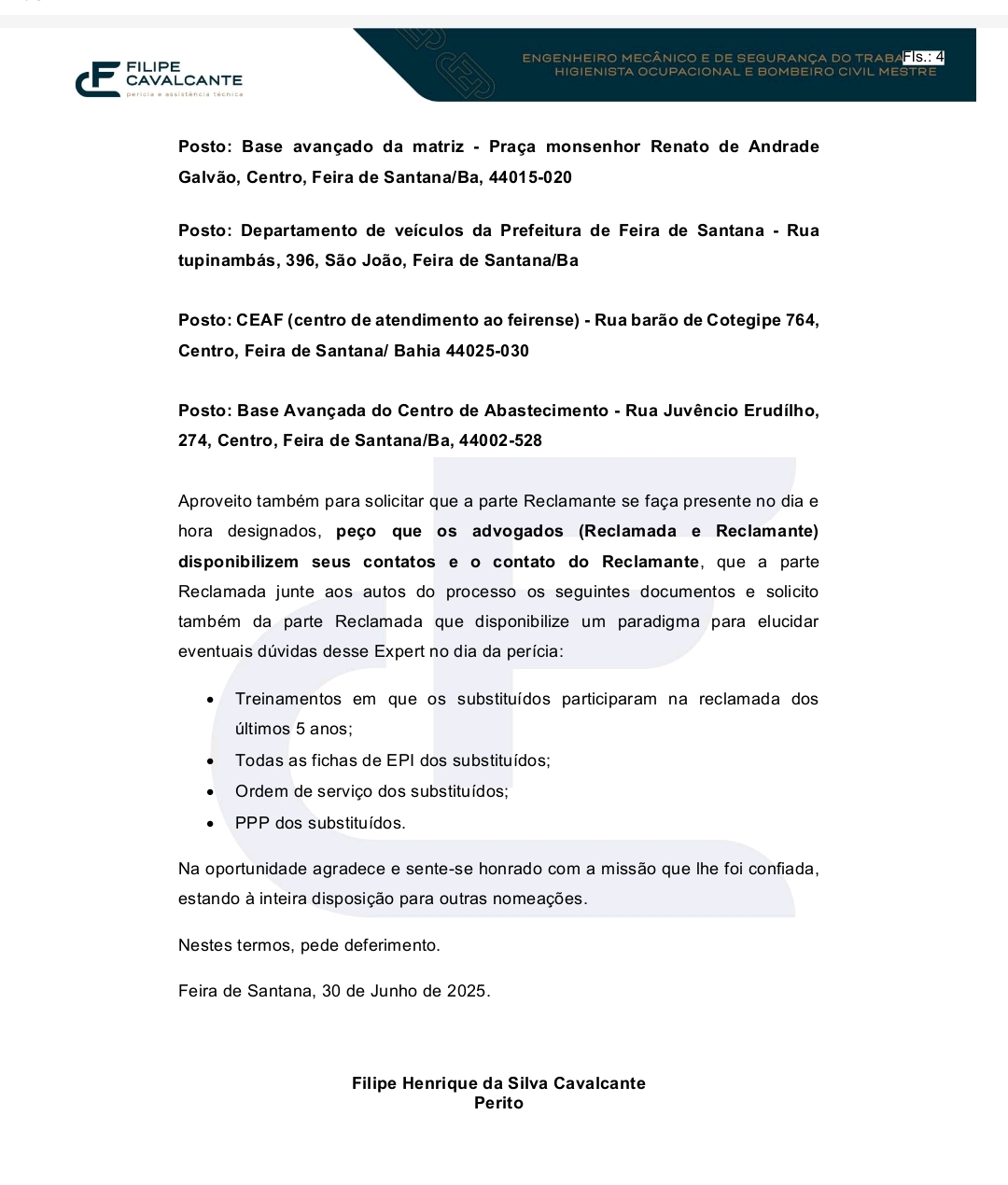 O perito solicitou ainda a presença das partes e advogados, além da disponibilização de documentos por parte da prefeitura, como fichas de Equipamentos de Proteção Individual (EPIs), ordens de serviço, PPPs e registros de treinamentos realizados nos últimos cinco anos.
