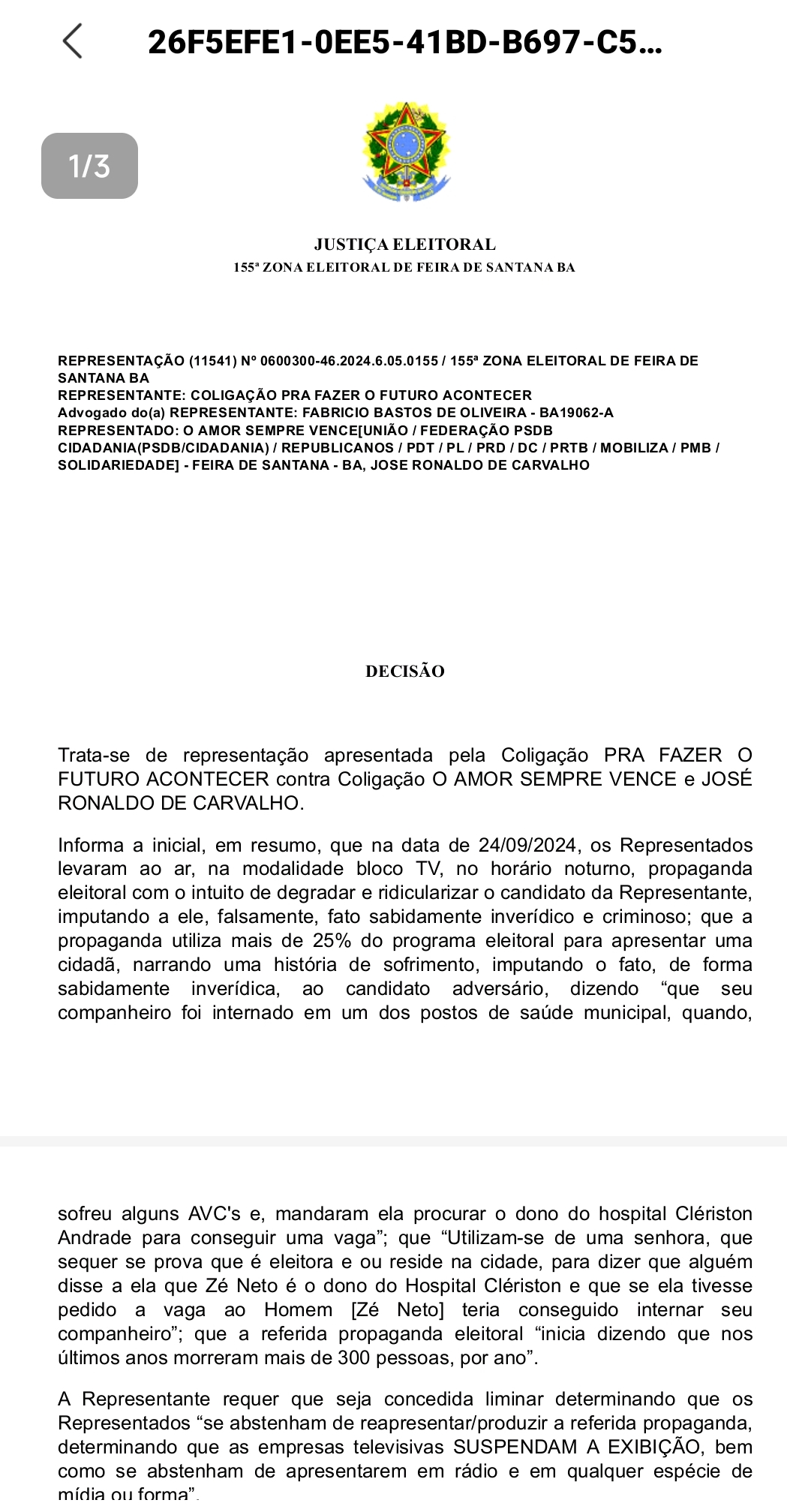 De acordo com a cooperação cooperativa da campanha de Zé Neto, adversário de Zé Ronaldo, as propagandas impugnadas trouxeram inverdades sobre os serviços de saúde prestados no município. Em resposta, Felipe Freitas, coordenador da campanha de Zé Neto, lamentou o uso de fake news como estratégia eleitoral.