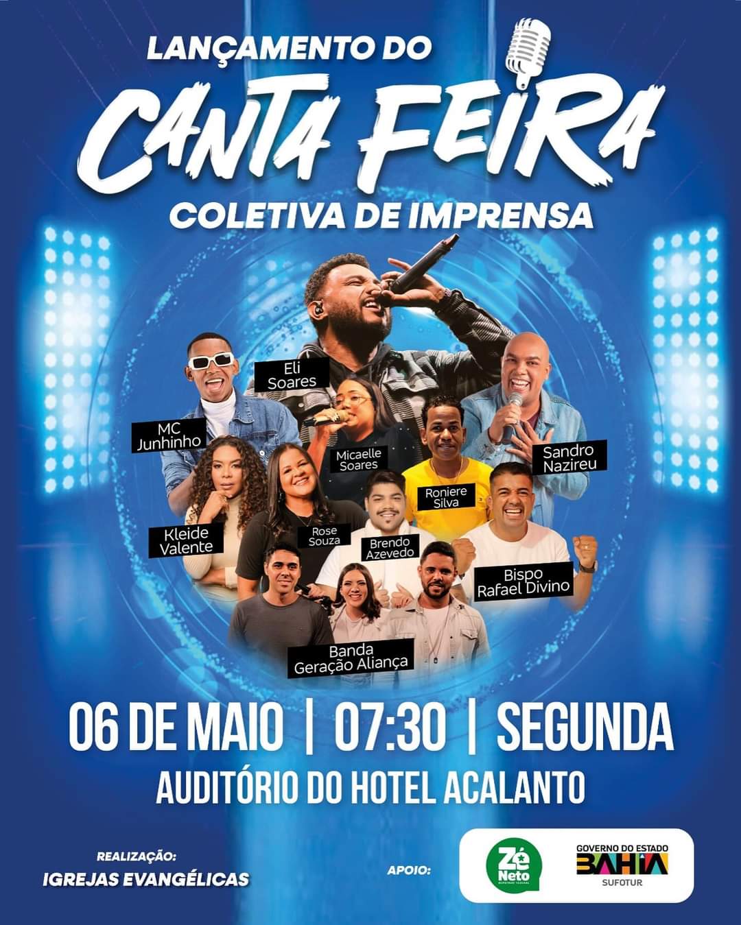 Esta é a 1ª edição do Canta Feira, que traz para o cenário musical de Feira a música gospel. Não tenho dúvidas que será um noite de muita alegria, paz, musicalidade, cultura, louvor e reverência a Jesus Cristo entre nós.