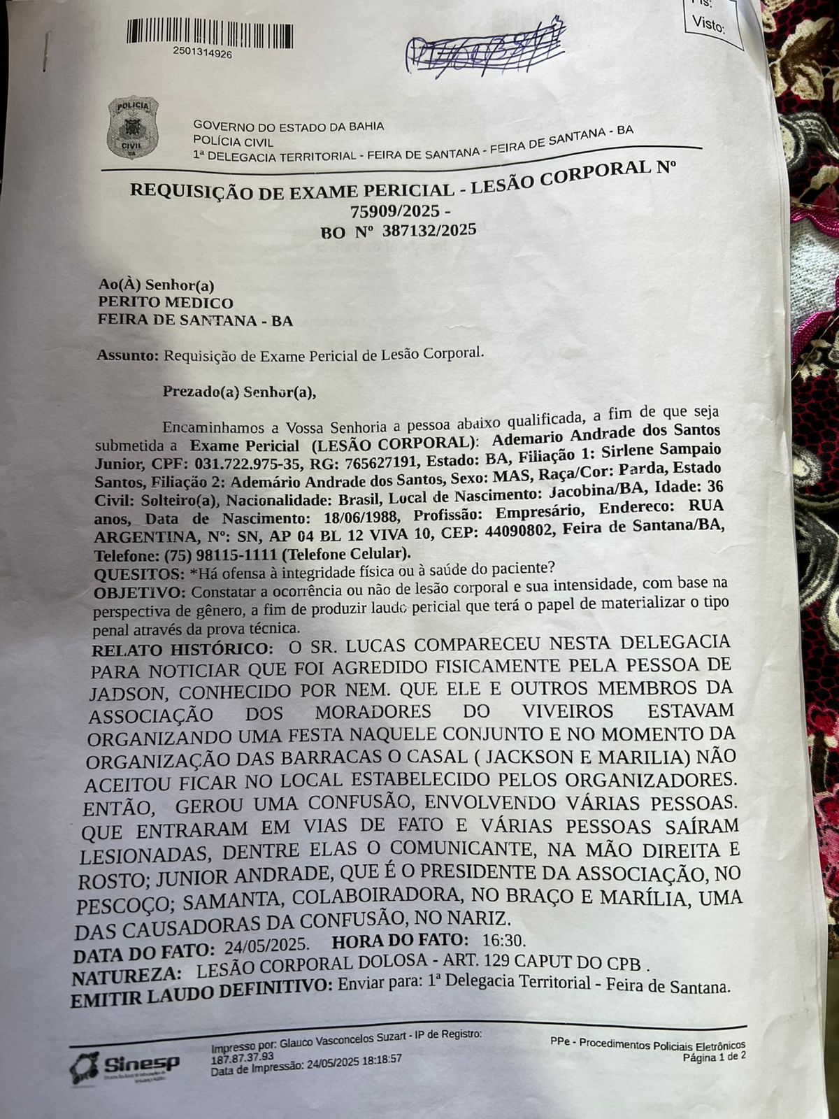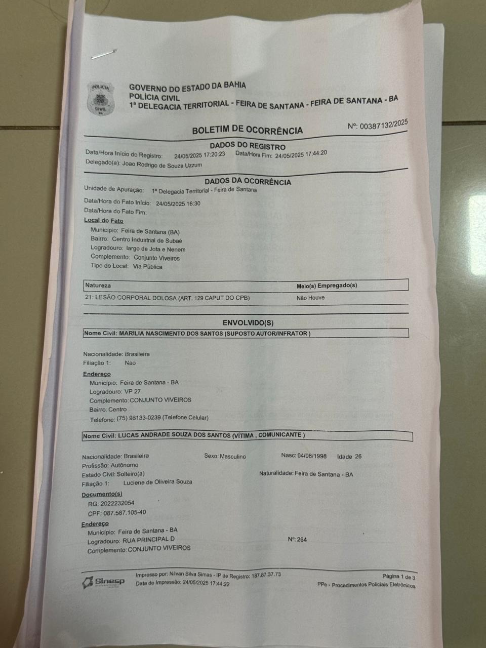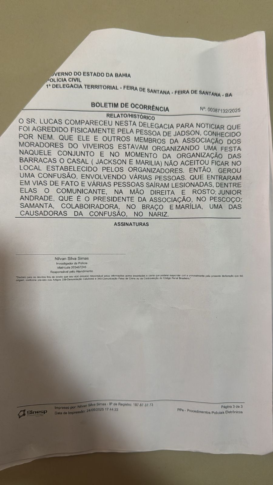 Veja abaixo o Boletim de Ocorrência