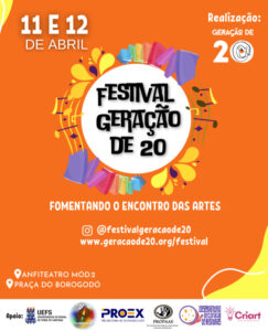 Literatura, música, performance, contação de histórias, desenhos e artesanato estão previstos para o ”Festival Geração de 20”, que acontece na Universidade Estadual de Feira de Santana (Uefs), nos dias 11 e 12 de abril. A programação é promovida pelo Movimento Poético Geração de 20, em parceria com o Diretório Acadêmico de Letras (DALET) da Uefs.