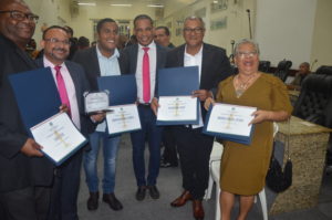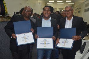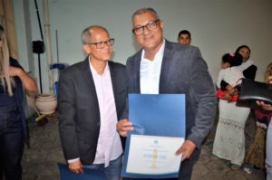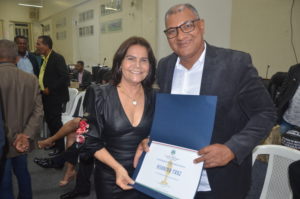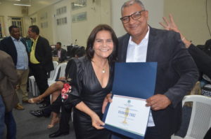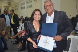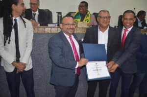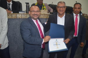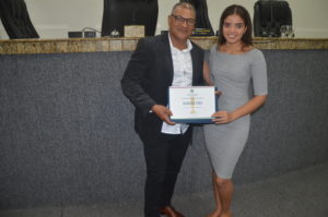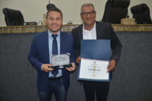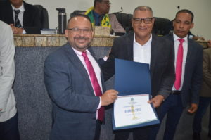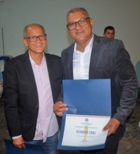 Osvaldo recebeu o certificado das mãos do vereador Professor Ivanberg Lima e Luiz da Feira. O Radialista estava acompanhando acompanhado de sua esposa Krisna Santos e sua secretária Mikaelle Lima.