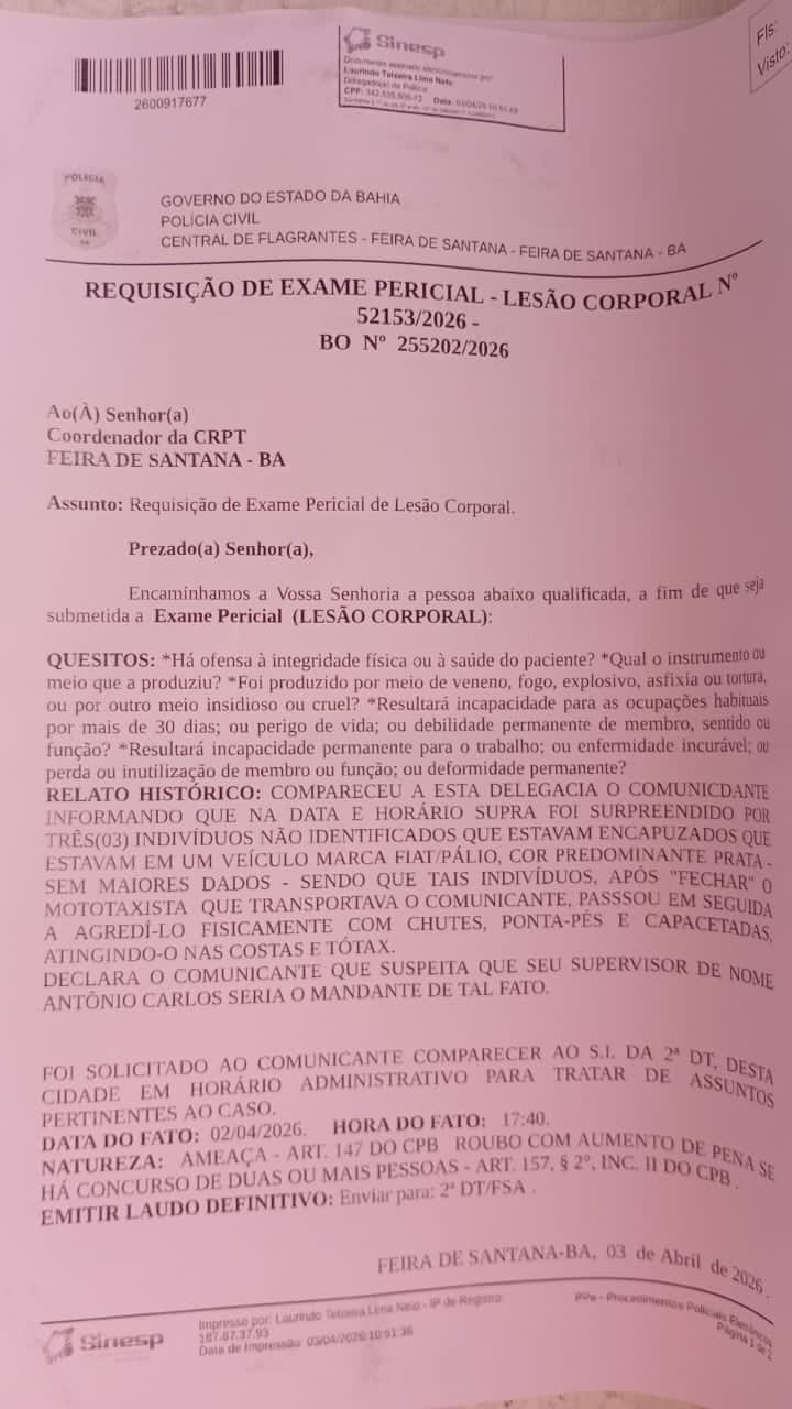 A versão dos fatos foi confirmada também na requisição de exame de lesão corporal, que atesta a gravidade da agressão sofrida pela vítima. Em seu depoimento, Adriano relatou ainda que suspeita que seu supervisor, seja o mandante do ataque.