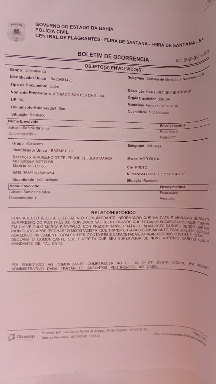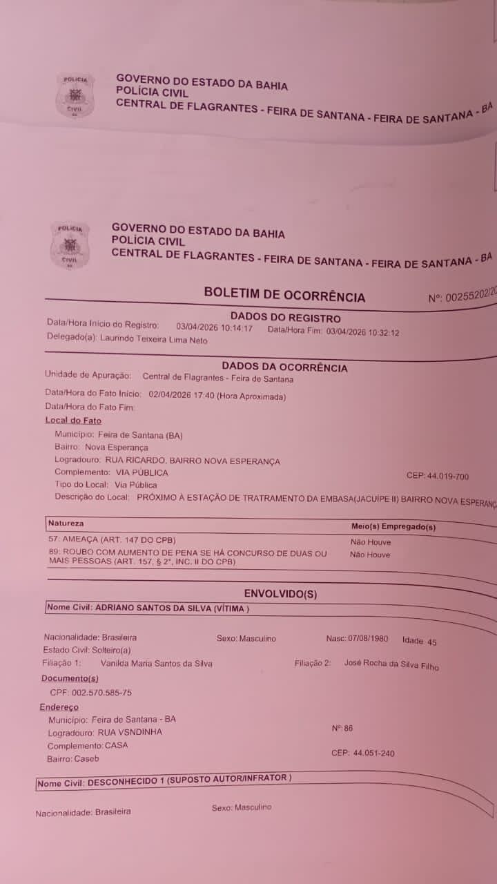 Figura conhecida no meio político, Adriano Santos da Silva, popularmente chamado de “Repórter Bicudo”, foi vítima de roubo seguido de agressão física na noite da última quinta-feira (02). O fato ocorreu na Rua Ricardo, bairro Nova Esperança, próximo à estação de tratamento da Embasa, conforme registrado no Boletim de Ocorrência (BO) nº 00255202/2026.