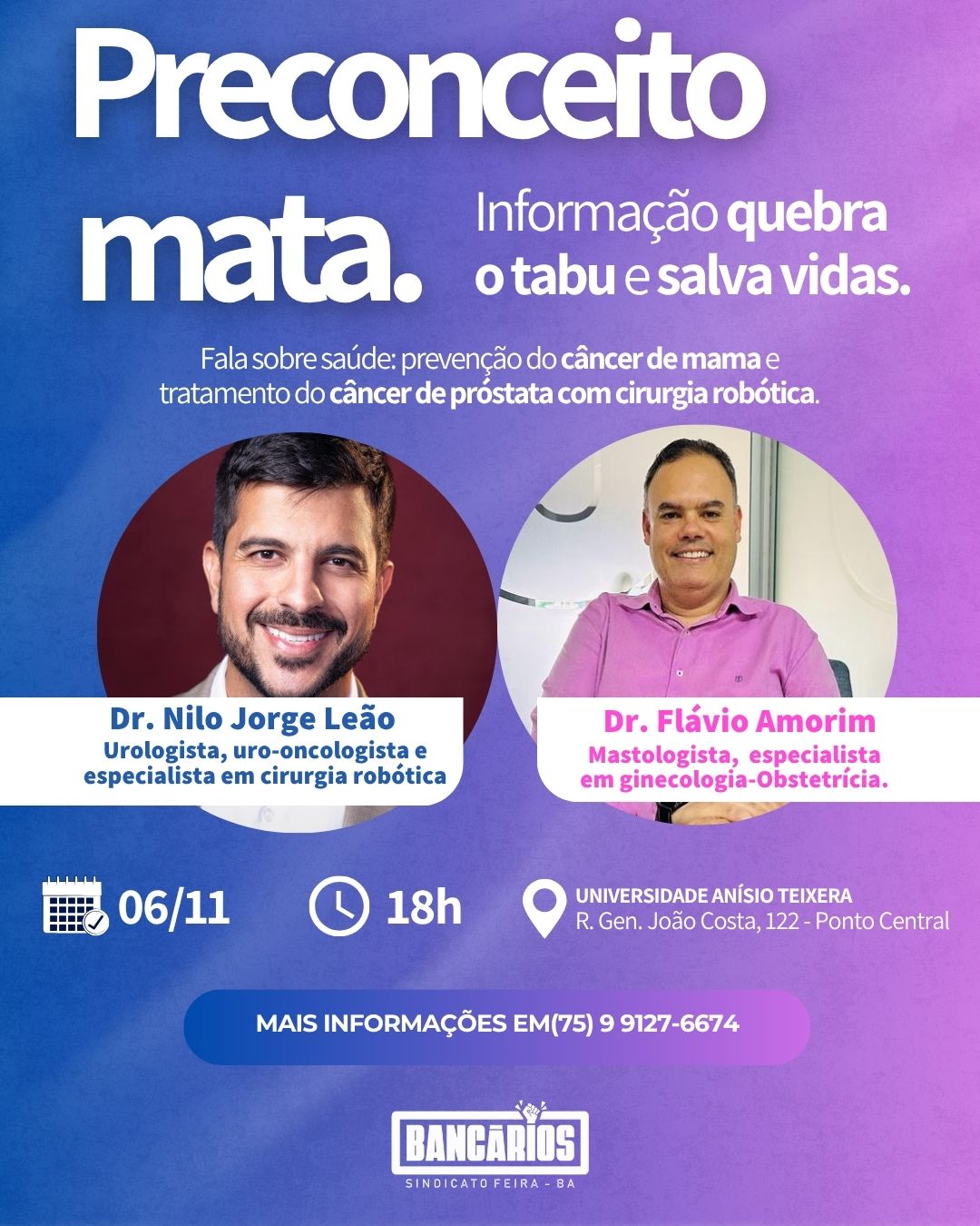 O Sindicato dos Bancários de Feira de Santana realiza, no dia 6 de novembro, o evento “Preconceito Mata – Informação quebra o tabu e salva vidas”, voltado à conscientização e prevenção dos cânceres de mama e de próstata. A atividade, que integra as campanhas Outubro Rosa e Novembro Azul, será realizada a partir das 18h, no Auditório Ernestina Silva Lima.