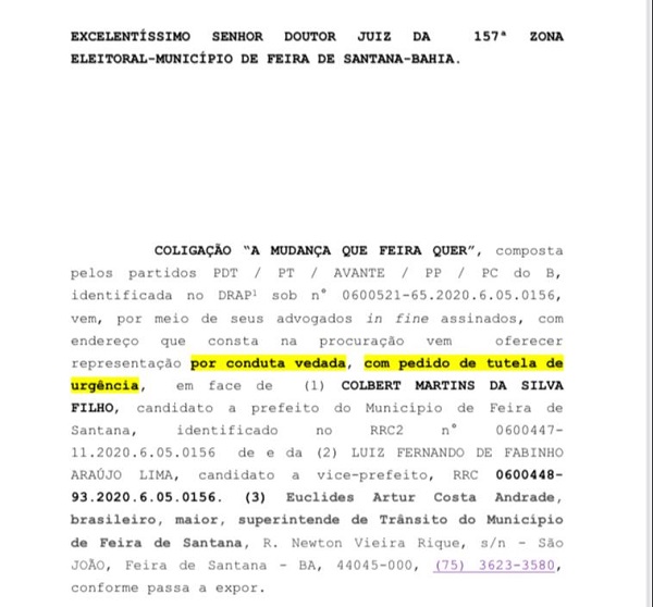 A representação, conforme a Assessoria Jurídica da Coligação, pretende “assegurar que as eleições municipais transcorrem de forma transparente e sem irregularidades, assim como ocorreu no primeiro turno e como Coligação ‘A Mudança Que Feira Quer’ vem fazendo desde o início do processo eleitoral”.