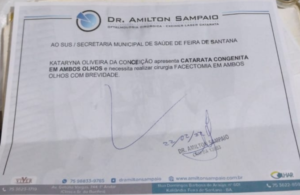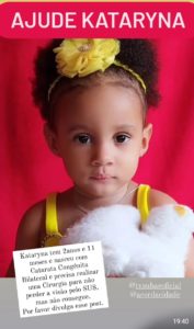 O pedido vem de dona Milena Araújo mãe da garotinha Kataryna de 2,11 anos, para que ela consiga fazer uma cirurgia de Facectomia com implante de Lio. Ela é moradora de Feira de Santana no Bairro Mangabeira.