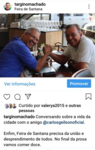 Ao final do bate papo, Targino posta foto com a seguinte frase na rede social Instagran, “Enfim, Feira de Santana precisa de união e desprendimento de todos. Ao final vamos comer doces!“, disse Targino.