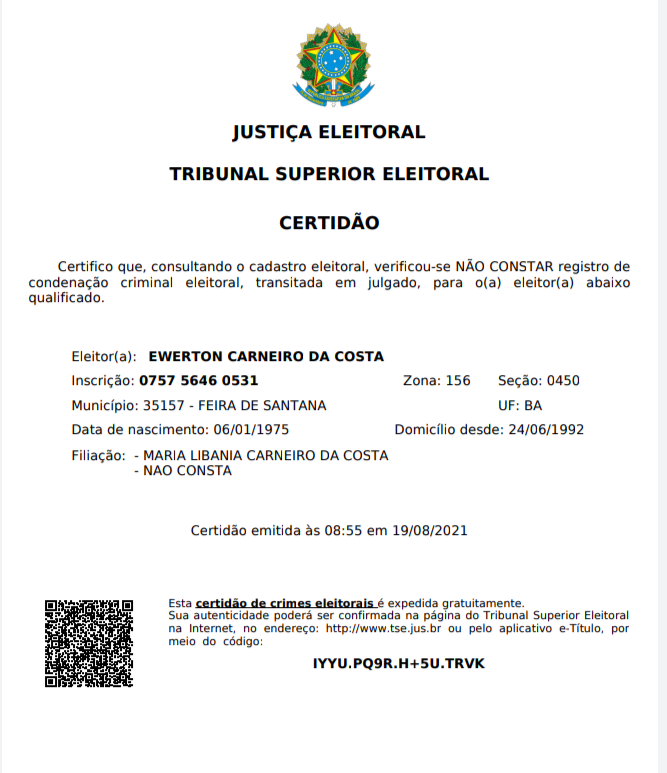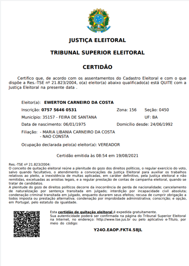 Certifico que, de acordo com os assentamentos do Cadastro Eleitoral e com o que dispõe a Res.-TSE nº 21.823/2004, o(a) eleitor(a) abaixo qualificado(a) está QUITE com a