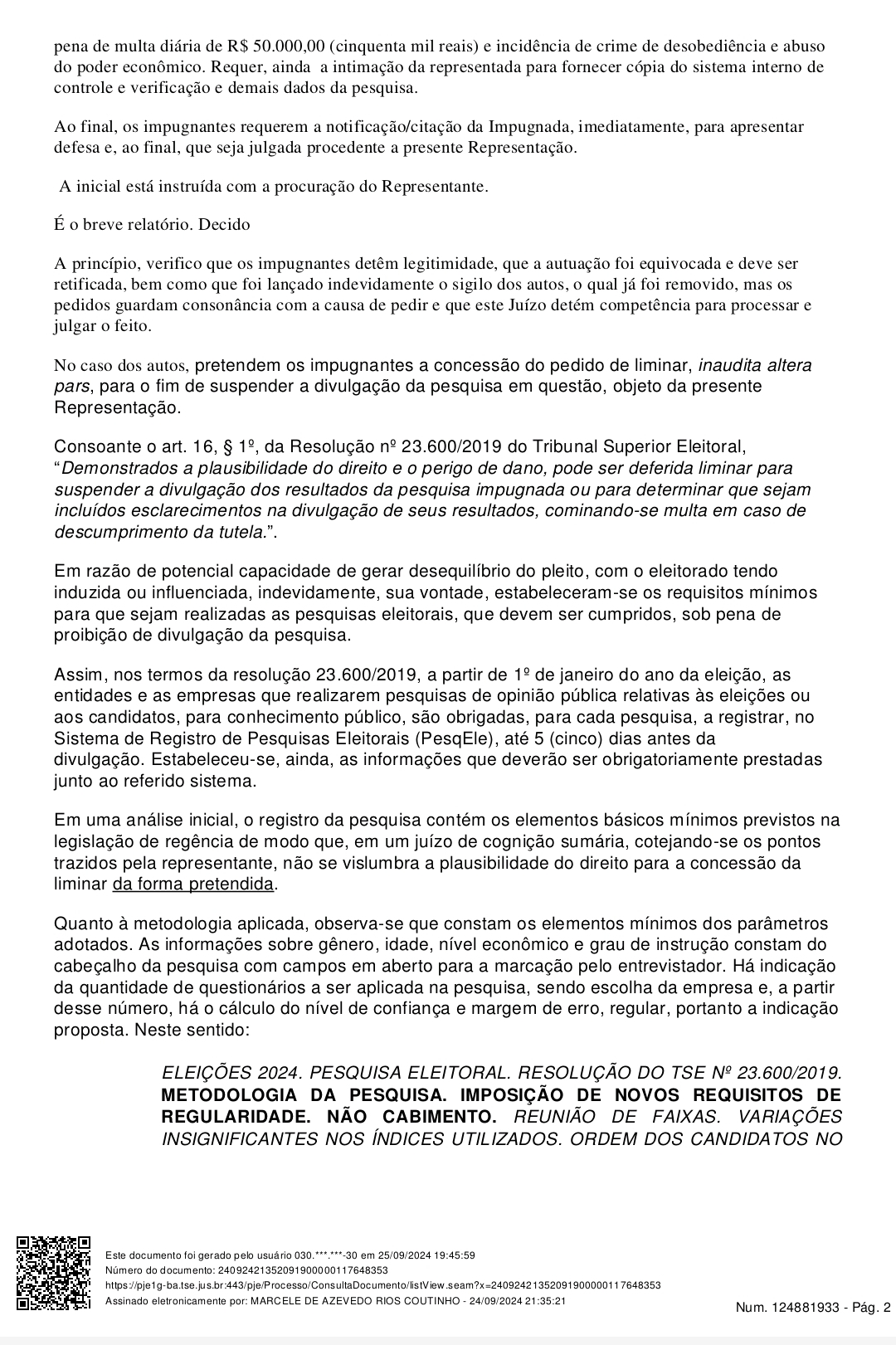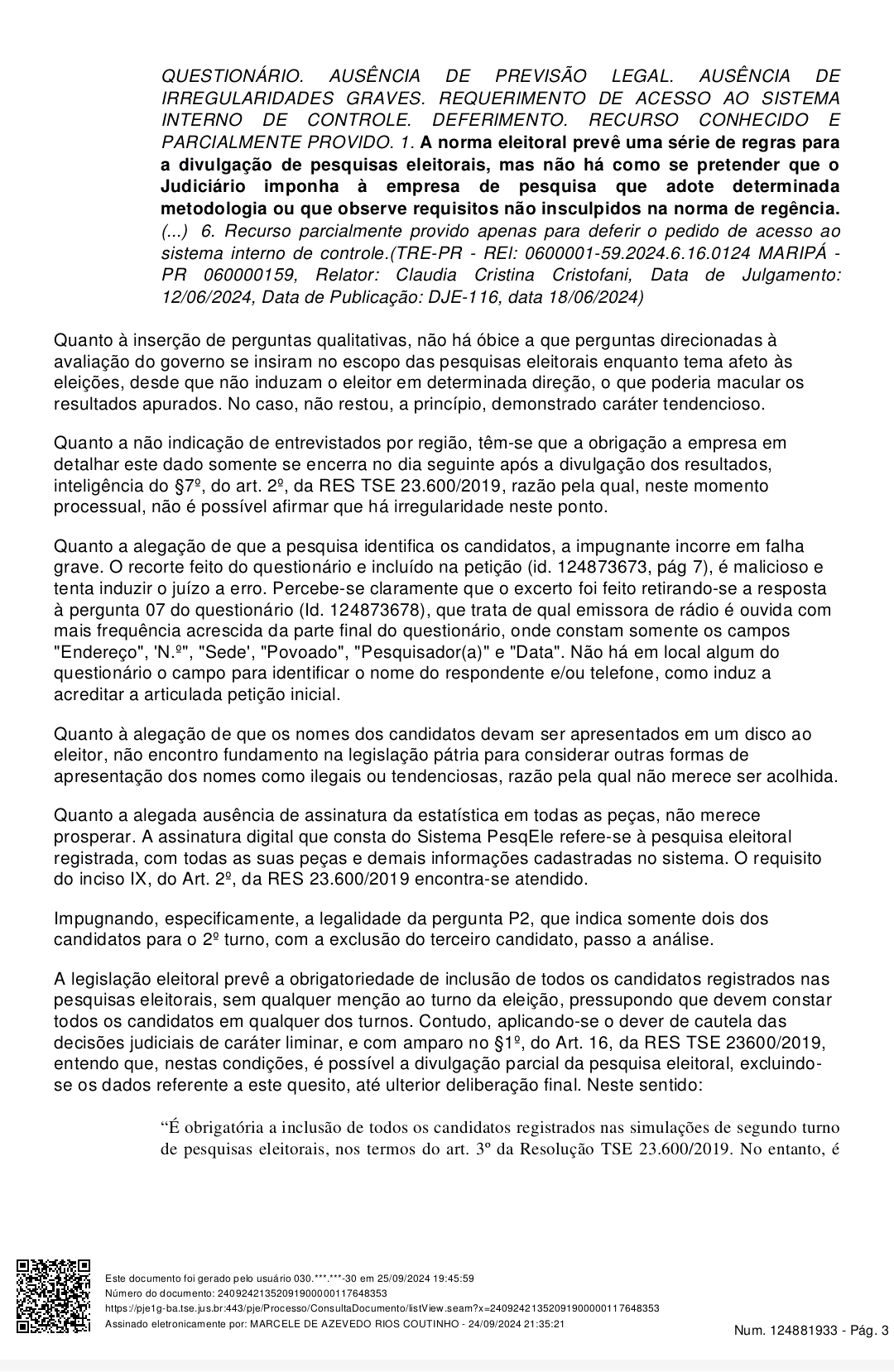 Além disso, a impugnação contestou a legalidade das perguntas formuladas na pesquisa, afirmando que uma delas excluía um dos candidatos em simulações de segundo turno, o que poderia induzir o eleitor a uma escolha tendenciosa. A coligação solicitou ainda que a empresa fornecesse cópias do sistema de controle e verificação utilizado na coleta de dados.
