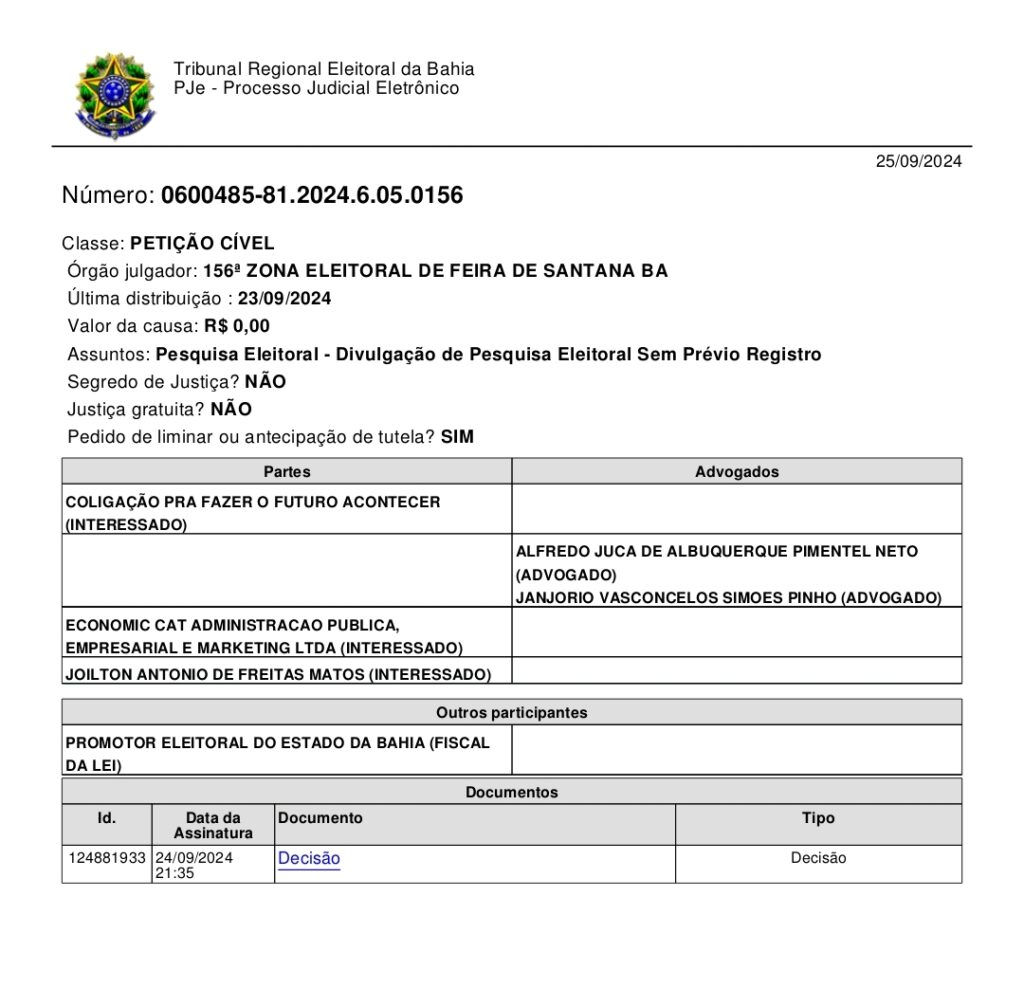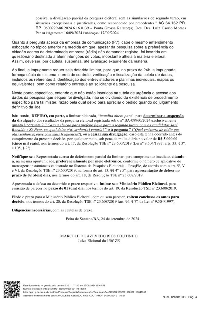 A 156ª Zona Eleitoral de Feira de Santana decidiu suspender a divulgação dos resultados da pesquisa do Instituto Economic, registrada sob o número BA-09960/2024, atendendo a um pedido de liminar feito pela Coligação Pra Fazer o Futuro Acontecer, do candidato a prefeito Zé Neto. A decisão foi proferida pela juíza Marcela de Azevedo Rios Coutinho, após análise de uma impugnação que apontava irregularidades na metodologia da pesquisa.