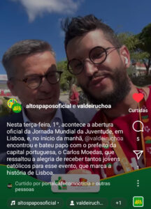 Nesta terça-feira, 1º, acontece a abertura oficial da Jornada Mundial da Juventude, em Lisboa, Portugal. Neste primeiro dia, o Radialista Valdeir Uchoa, âncora do programa Altos Papos da Rádio Princesa FM, entrevistou o prefeito de Lisboa, Calos Moedas. Valdeir é um dos radialistas de Feira de Santana neste evento.
