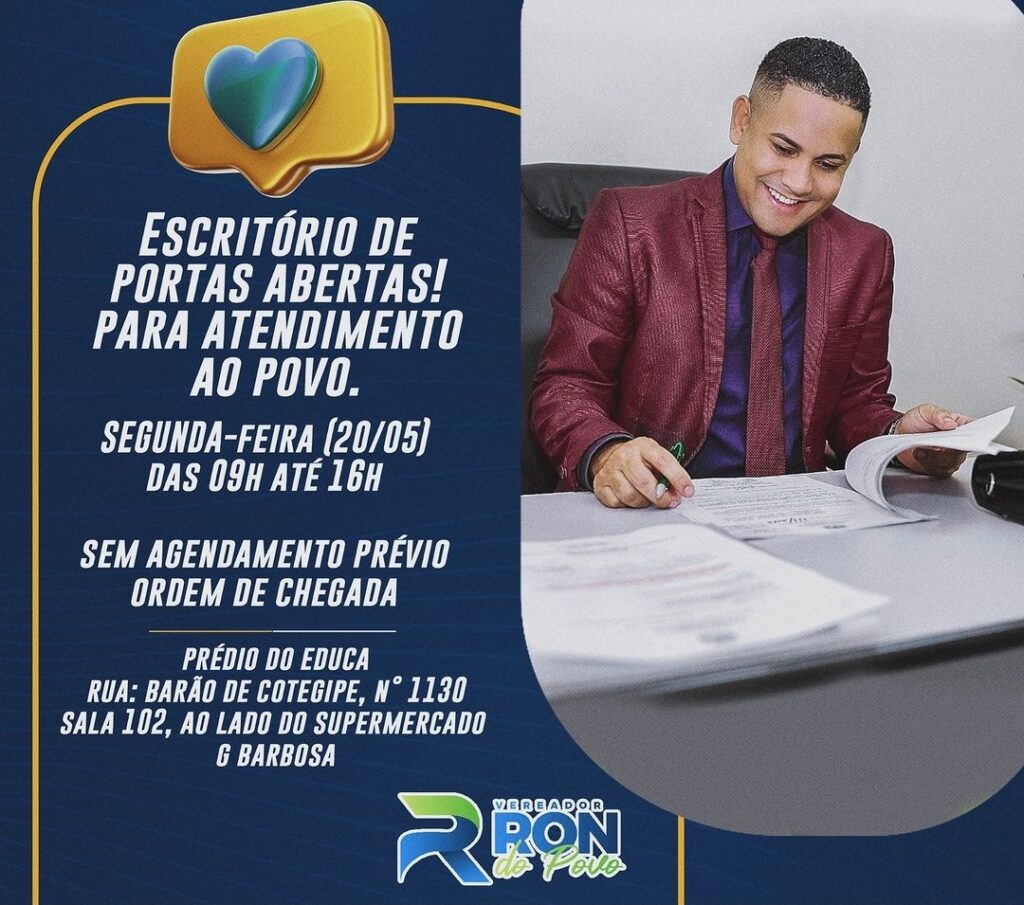 O vereador de Feira de Santana, Ronaldo Caribé, Ron do Povo, está adotando uma abordagem acessível para atender às necessidades dos cidadãos. Seu escritório político estará aberto para o público na segunda-feira, 20 de maio, das 09h às 16h, sem a necessidade de agendamento prévio.
