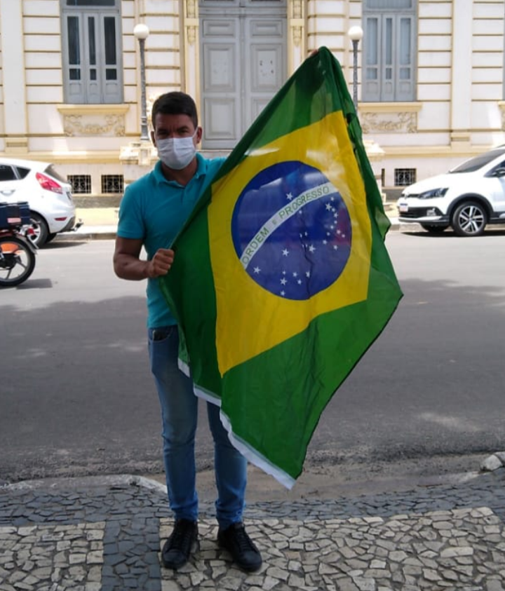 Na frente da prefeitura Pedro posou usando uma bandeira do Brasil.