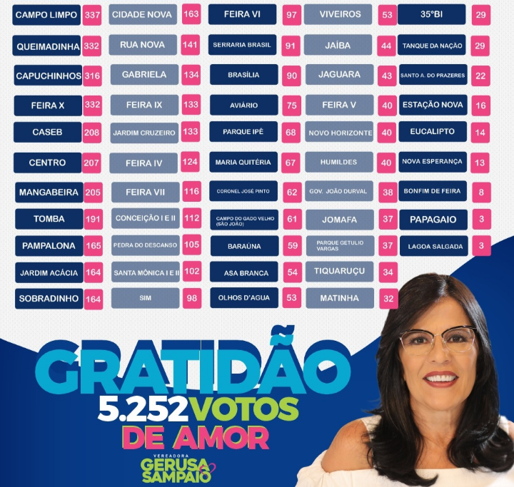A edil foi votada em 45 bairros e em todos os oito distritos. Ela tem atuação no social em toda cidade e sempre que disputa eleição tem surpreendido pela votação pulverizada em quase todas urnas.