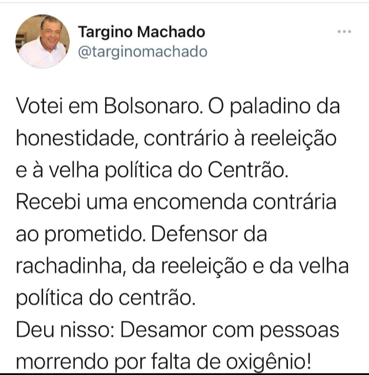 Targino demonstrou insatisfação com a postura do presidente Jair Messias Bolsonaro. “Votei em Bolsonaro. Paladino da moralidade, contrário a reeleição e a política à velha política do centrão. Recebi uma encomenda contrária ao prometido. Defensor da rachadinha, da reeleição, e da velha política do centrão. Deu nisso: Desamor com as pessoas morrendo por falta de oxigênio!”, Disse Targino.