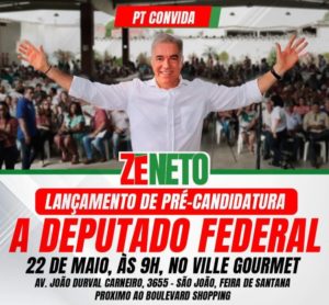 O Partido dos Trabalhadores (PT) de Feira de Santana oficializa neste domingo (22) a pré-candidatura à reeleição do deputado federal Zé Neto para Câmara dos Deputados. O evento acontece às 9h, no Ville Convention (Ville Goumert), na Av. João Durval.