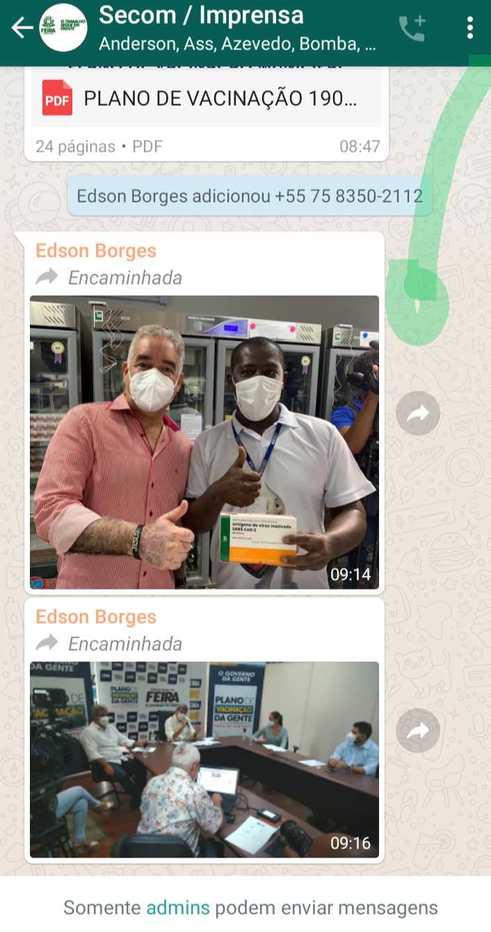 Durante a manhã desta terça-feira (19), o grupo oficial de Whatsapp da Secom- Secretaria de Comunicação Social da Prefeitura de Feira de Santana, postou uma foto do deputado federal José de Cerqueira Neto (PT), ao lado do coordenador da 2° Dires Edy Gomes. segurando uma caixa da vacina contra a Covid 19. A foto foi postada pelo próprio secretário municipal de comunicação, jornalista Edson Borges.
