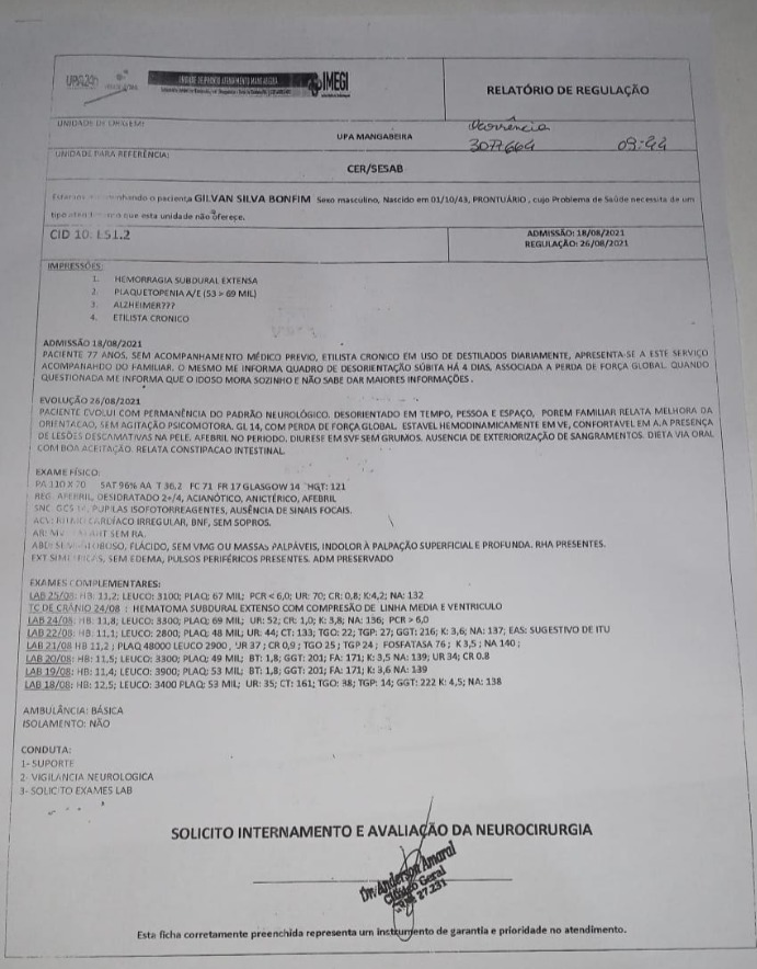 O ancião de 77 anos apresentou quadro de Hemorragia subdural extensa, Plaquetopenia A/E e Alzheaime.
