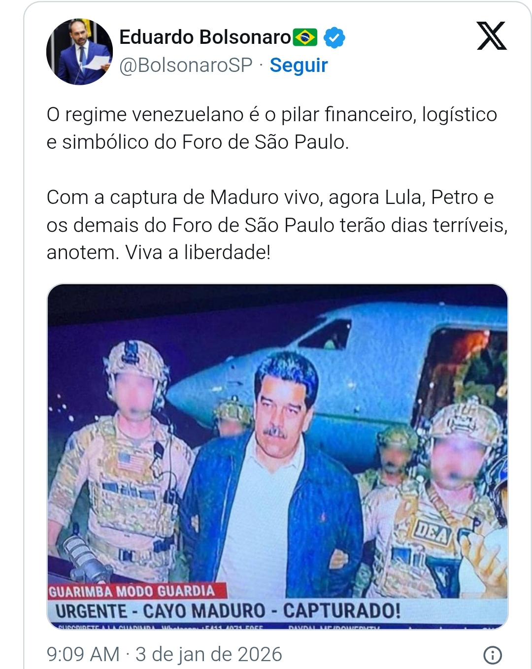 Na imagem compartilhada, Maduro aparece escoltado por dois militares norte-americanos, que exibem nos coletes a sigla da DEA, a Administração de Repressão às Drogas dos Estados Unidos. Eduardo Bolsonaro afirmou que o governo venezuelano representa o principal sustentáculo financeiro, logístico e simbólico do Foro de São Paulo, organização política que reúne partidos e movimentos de esquerda da América Latina e do Caribe. O grupo foi criado pelo presidente Luiz Inácio Lula da Silva e pelo ex-presidente cubano Fidel Castro.