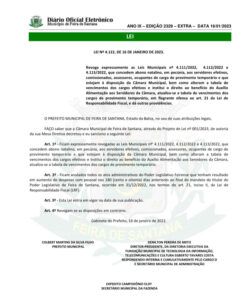 A Câmara Municipal de Feira de Santana através da administração da presidente Eremita Mota PSDB, aprovou projetos de leis que ficaram conhecidas como “o revogaço” e na edição extraordinária do Diário Oficial do Município desta segunda-feira (16), o prefeito Colbert Martins MDB, sancionou a Lei do revogaço.