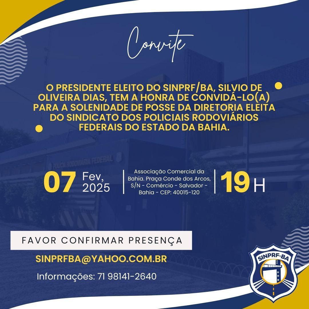 O Sindicato dos Policiais Rodoviários Federais do Estado da Bahia (SINPRF/BA) realiza, na próxima sexta-feira (07), a cerimônia de posse da nova diretoria para o triênio 2025/2028, tendo como presidente o policial rodoviário federal aposentado Silvio de Oliveira Dias e o vice, policial rodoviário federal também aposentado, Daniel Alves da Silva. O evento acontece a partir das 19h30, na Associação Comercial da Bahia, localizada na Praça Conde dos Arcos, S/N, Comércio, Salvador/BA.