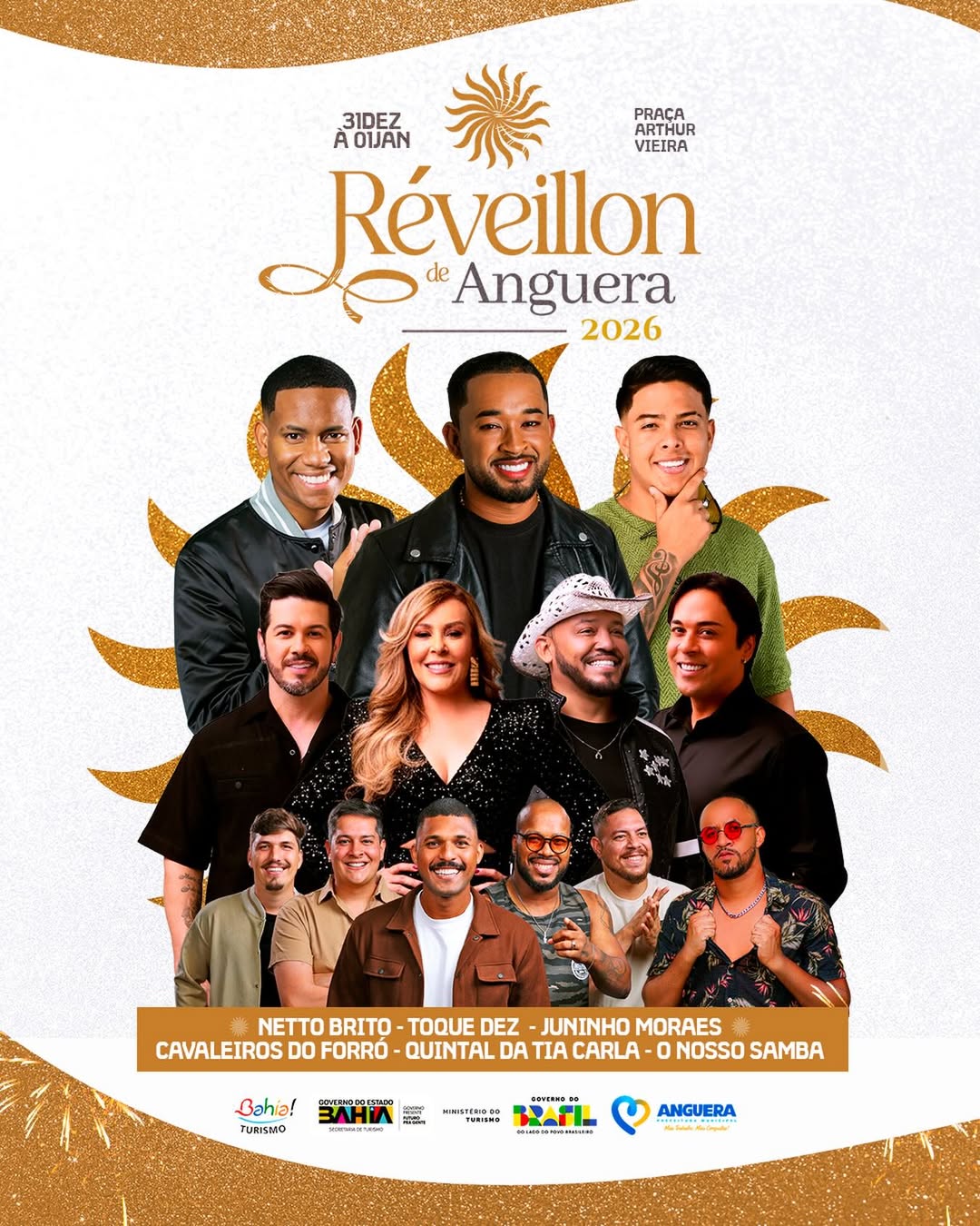 A festa se estende de 31 de dezembro de 2025 a 1º de janeiro de 2026 na Praça Arthur Vieira, com uma grade de atrações diversificada. Entre os nomes confirmados estão o Toque Dez, Netto Brito, Juninho Moraes, Cavaleiros do Forró, Quintal da Tia Carla e O Nosso Samba.