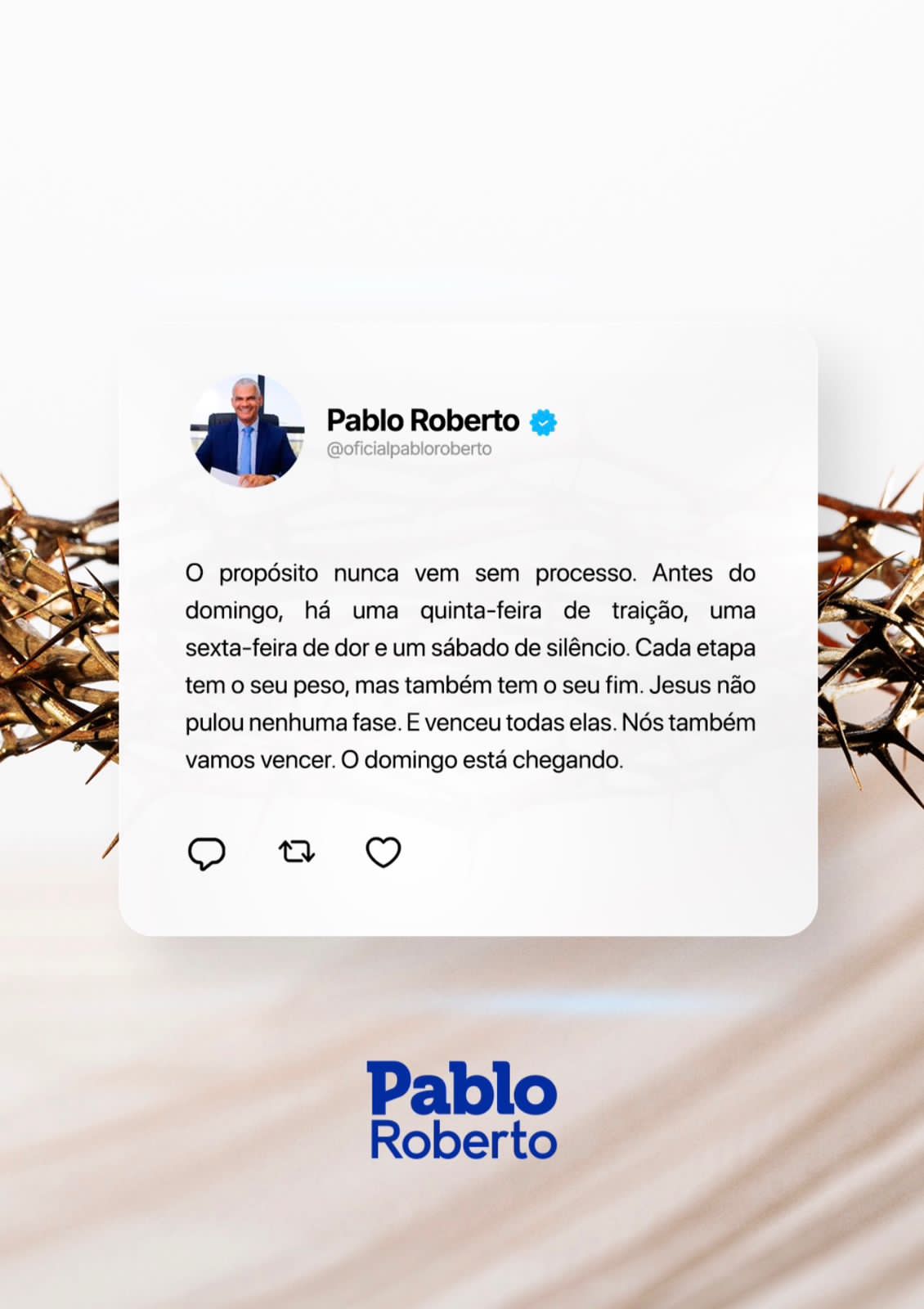 “O propósito nunca vem sem processo. Antes do domingo, há uma quinta-feira de traição, uma sexta-feira de dor e um sábado de silêncio. Cada etapa tem o seu peso, mas também tem o seu fim. Jesus não pulou nenhuma fase. E venceu todas elas. Nós também vamos vencer. O domingo está chegando.”