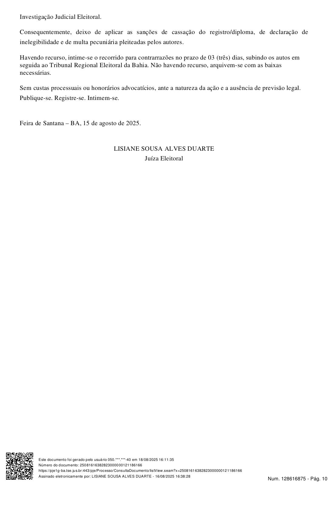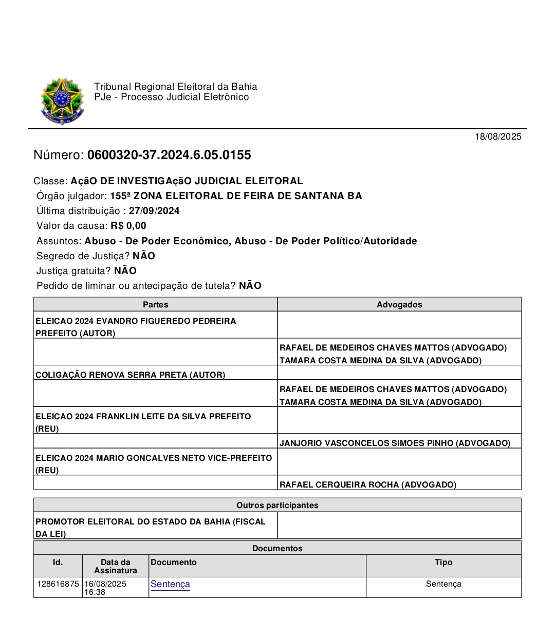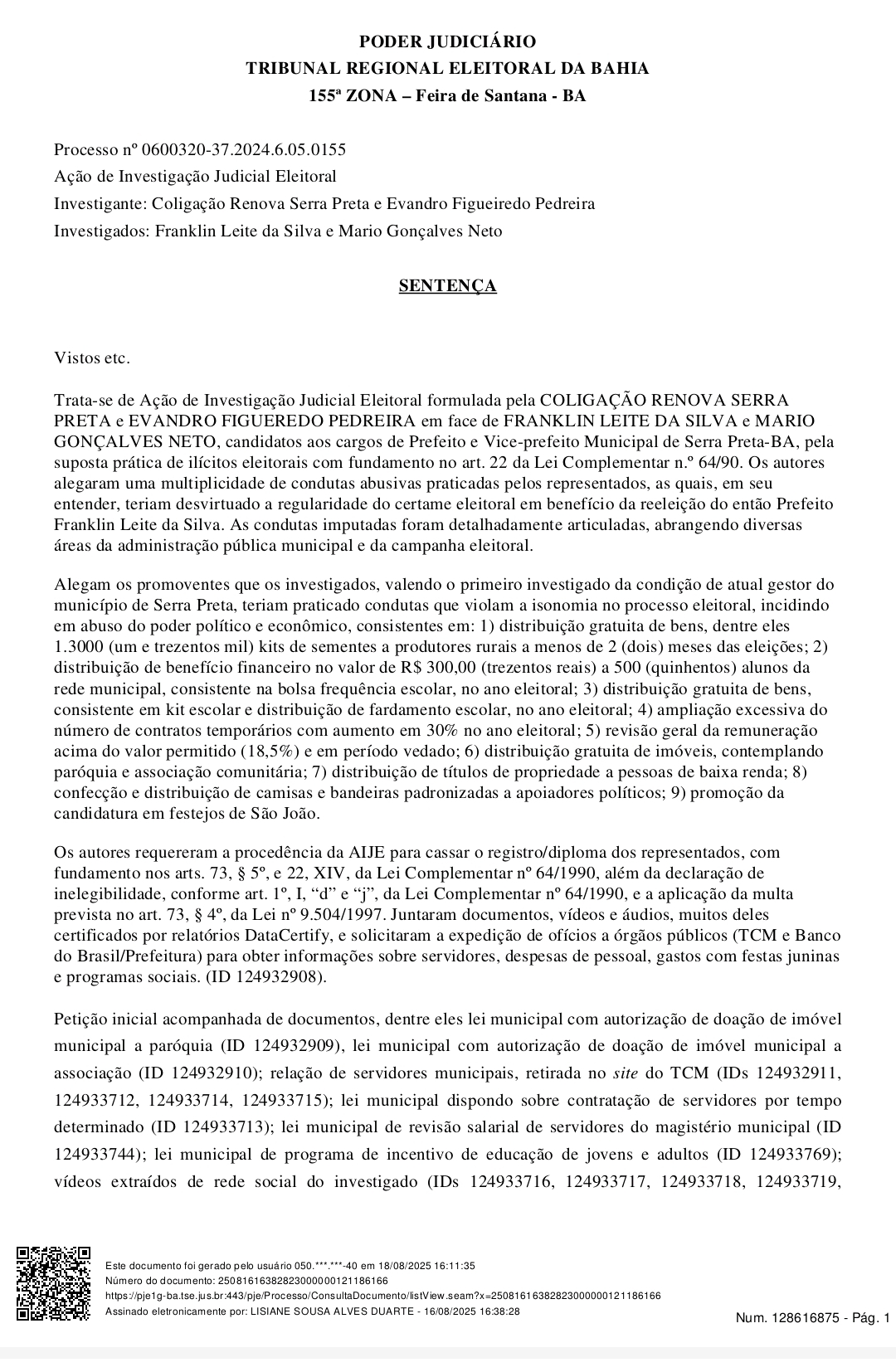 A juíza Lisiane Sousa Alves Duarte, da 155ª Zona Eleitoral de Feira de Santana, julgou improcedente a Ação de Investigação Judicial Eleitoral (AIJE) movida pela coligação Renova Serra Preta e pelo ex-candidato a prefeito Evandro Figueiredo Pedreira contra o prefeito de Serra Preta, Franklin Leite da Silva, e o vice-prefeito Mário Gonçalves Neto.