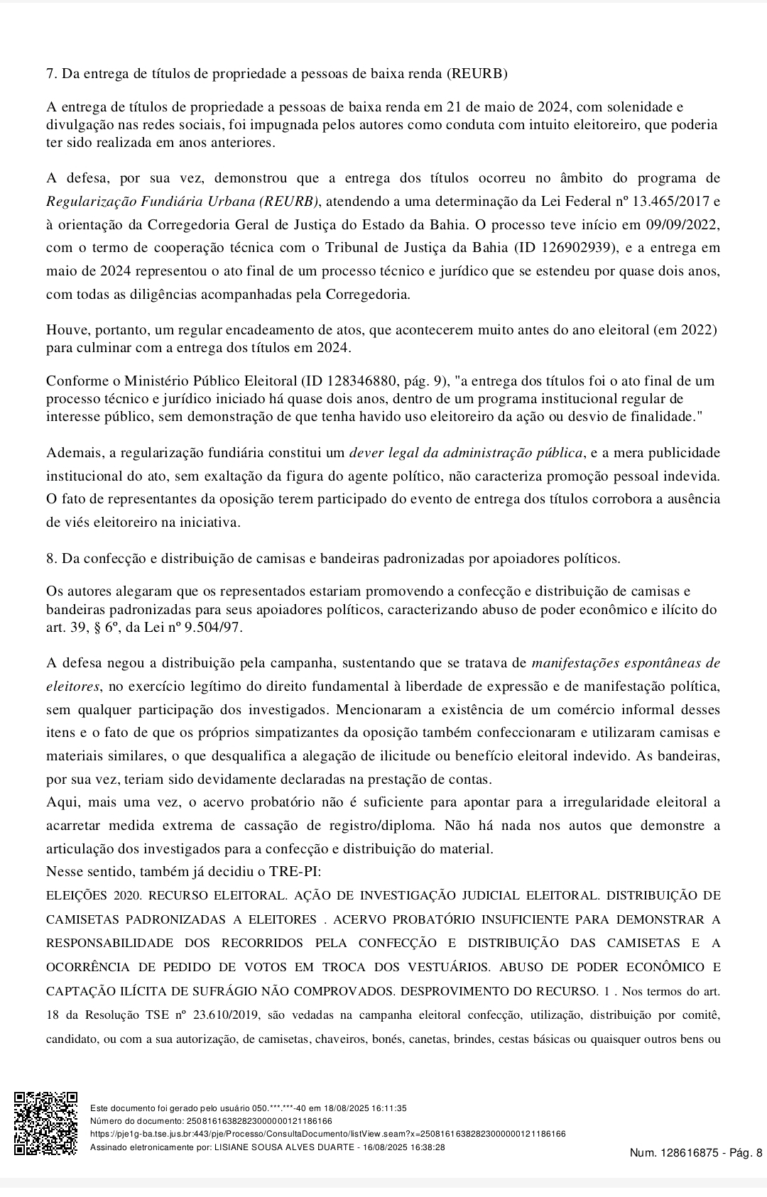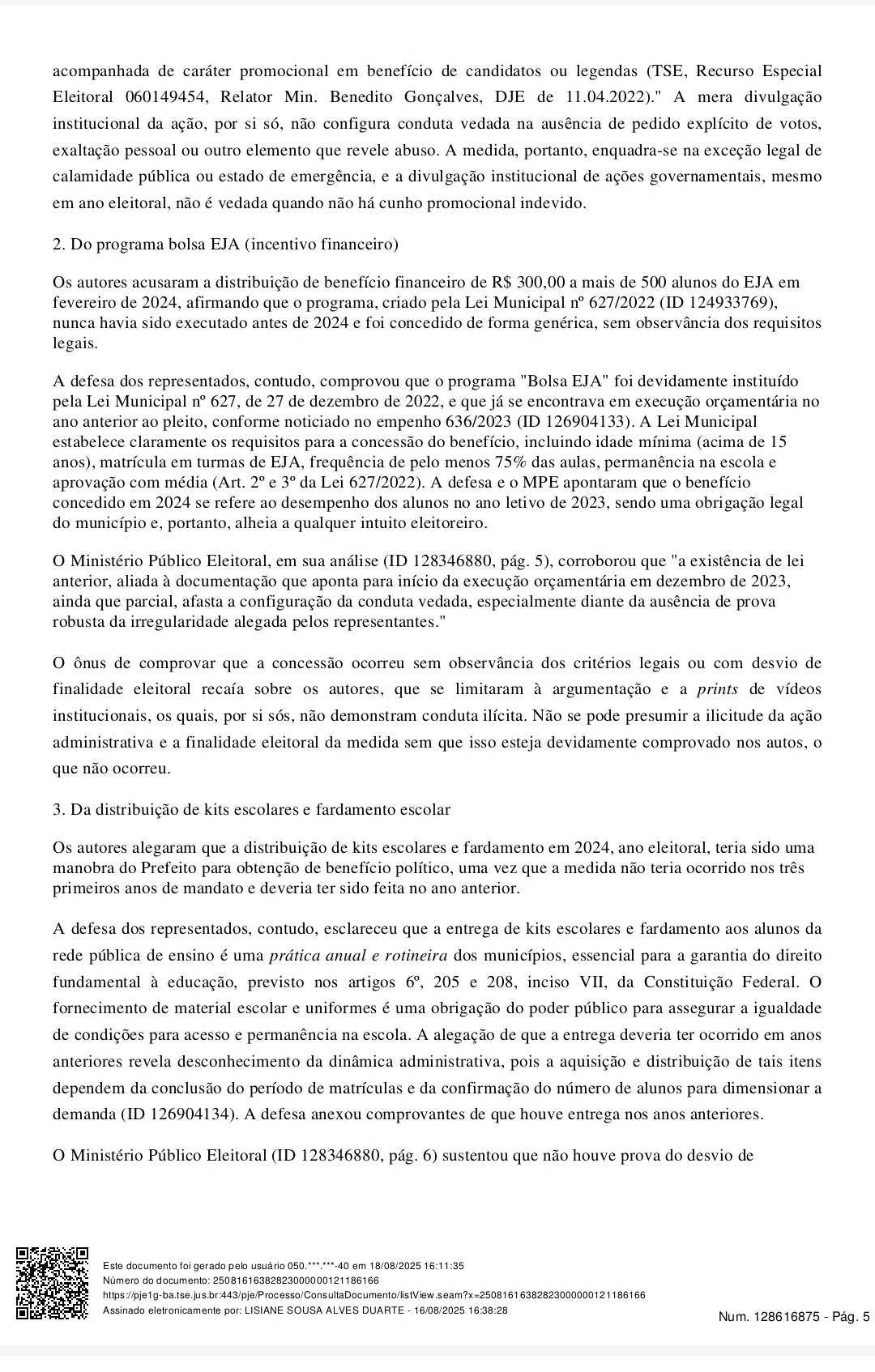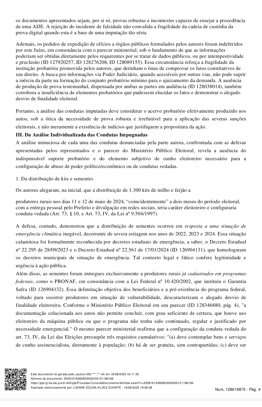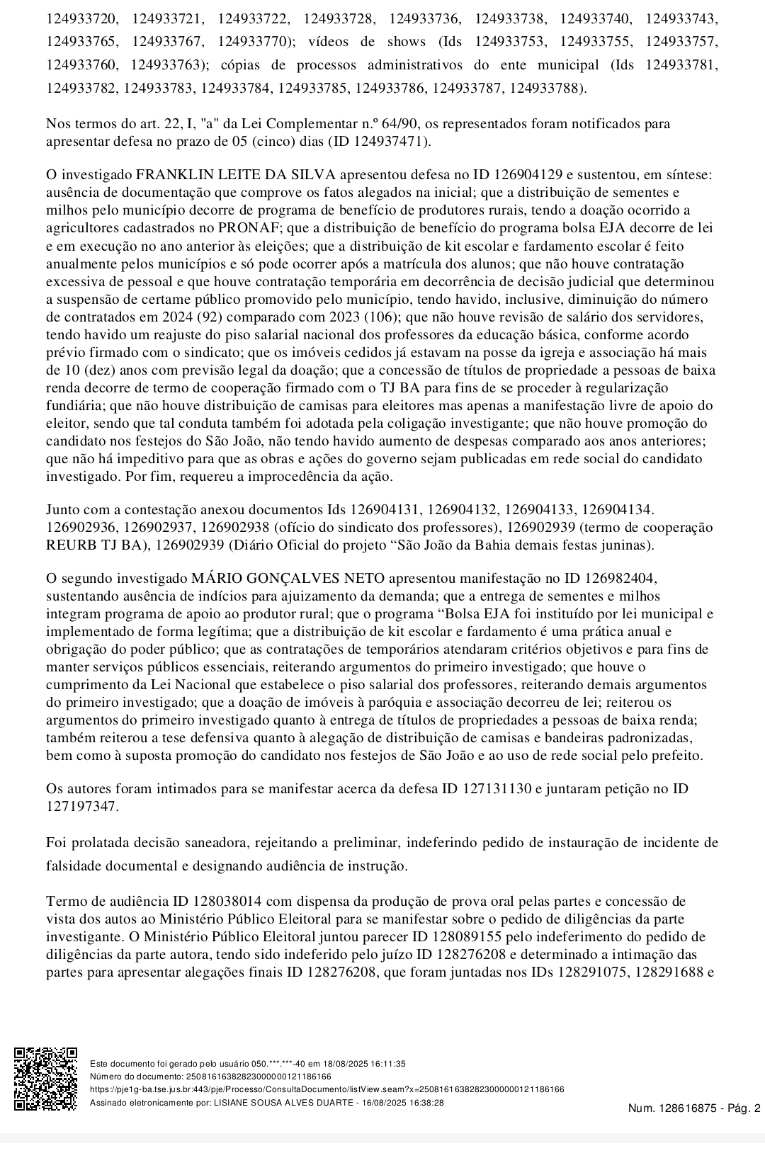 A ação pedia a cassação do diploma dos gestores por suposto abuso de poder político e econômico durante as eleições de 2024. Entre as acusações estavam a distribuição de sementes a produtores rurais, pagamento de bolsas escolares, entrega de kits e fardamentos a alunos, contratações temporárias, reajustes salariais, doação de imóveis públicos, concessão de títulos de propriedade, além de uso eleitoral de festas juninas e distribuição de material de campanha.