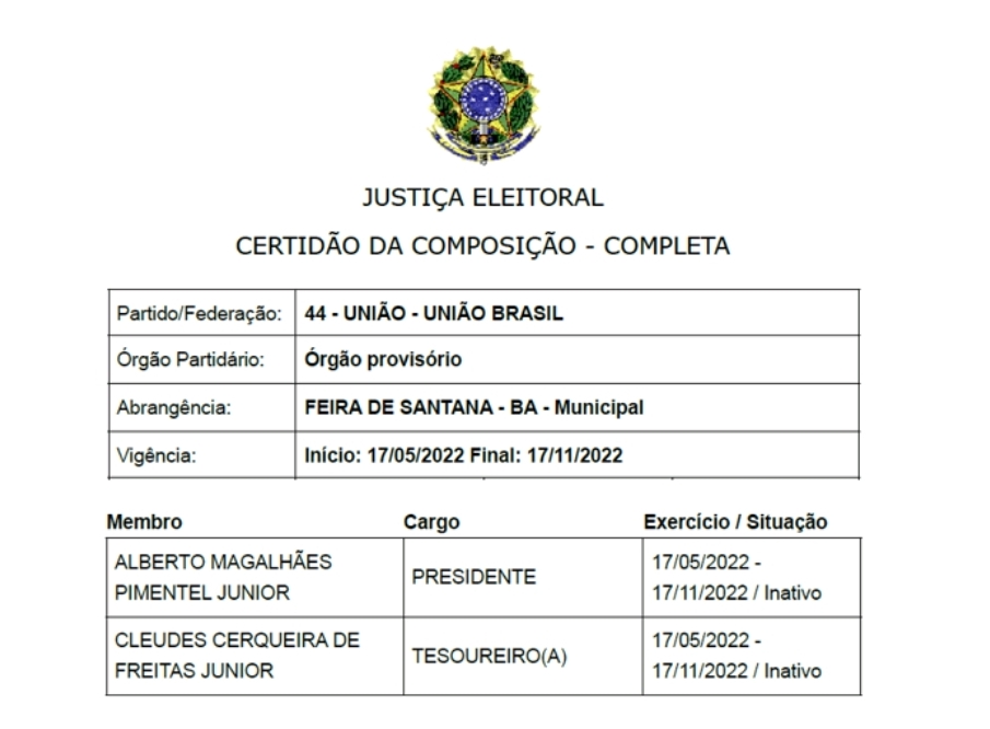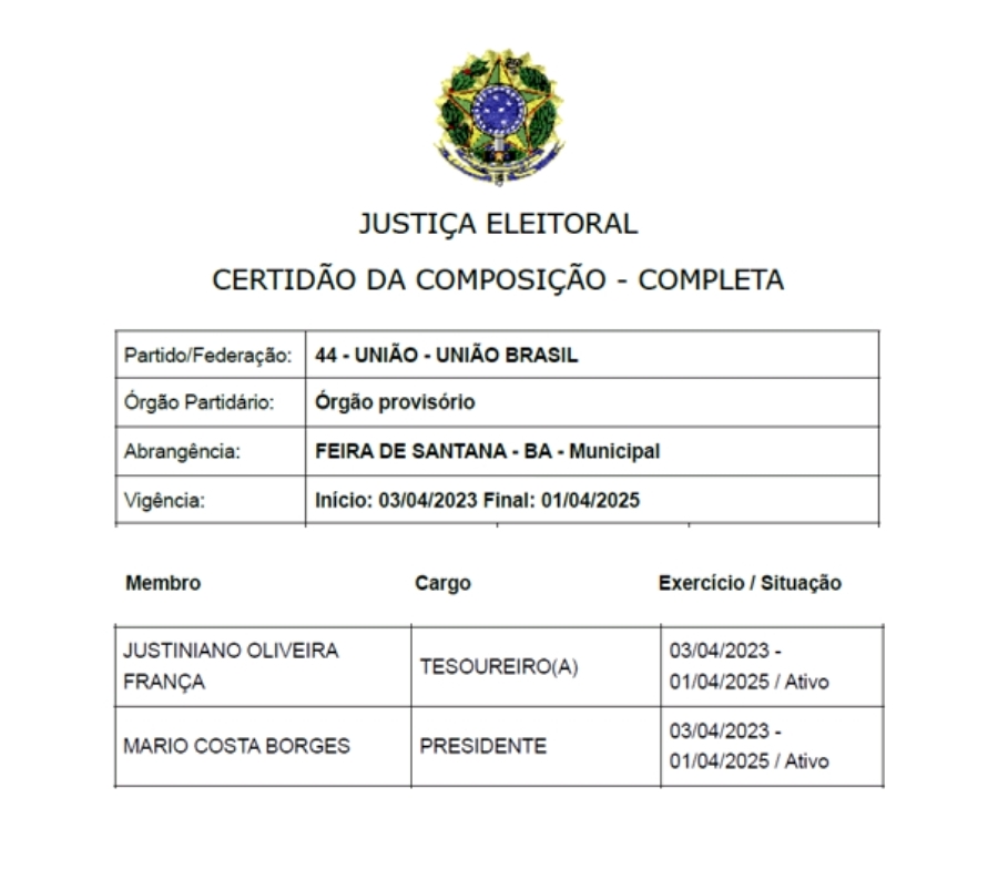 Diferentemente do divulgado, o atual presidente, Mário Borges, que dirige o União Brasil de Feira de Santana desde 3 de abril de 2023, e o tesoureiro Justiniano França, não respondem pelas contas do ano anterior (veja a seguir recorte da certidão extraída do site do TSE).