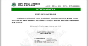 A exoneração de Borges Junior do cargo de secretário de Desenvolvimento Social saiu na edição extraordinária desta terça-feira (28). É bom lembrar que Borges já foi vice-prefeito de Feira de Santana ao lado do então prefeito Zé Ronaldo.