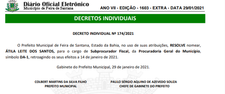 Saiu nesta sexta-feira 29, em edição extra do Diário Oficial do Município, a nomeação do advogado Átila Leite dos Santos através do DECRETO Individual Nº 174/2021 .