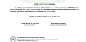 A nomeação de João Dias de Santana, para o cargo de Diretor do Departamento de Planejamento e Educação Ambiental, da Secretaria Municipal de Meio Ambiente e Recursos Naturais, símbolo DA-1, saiu na edição do DO- Diário Oficial do Município desta terça-feira (12).