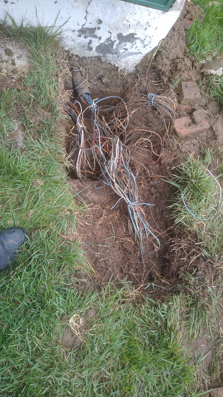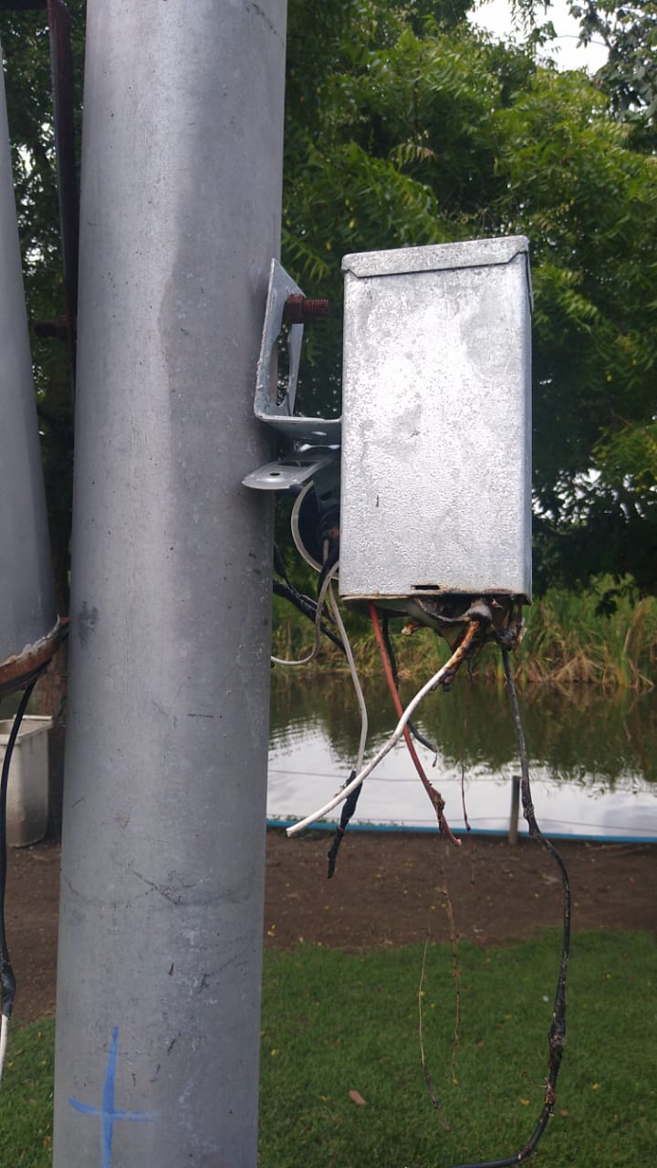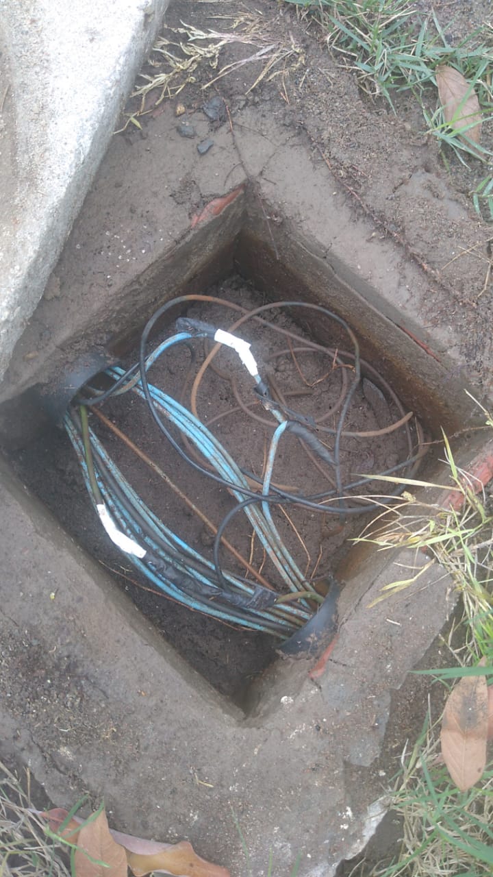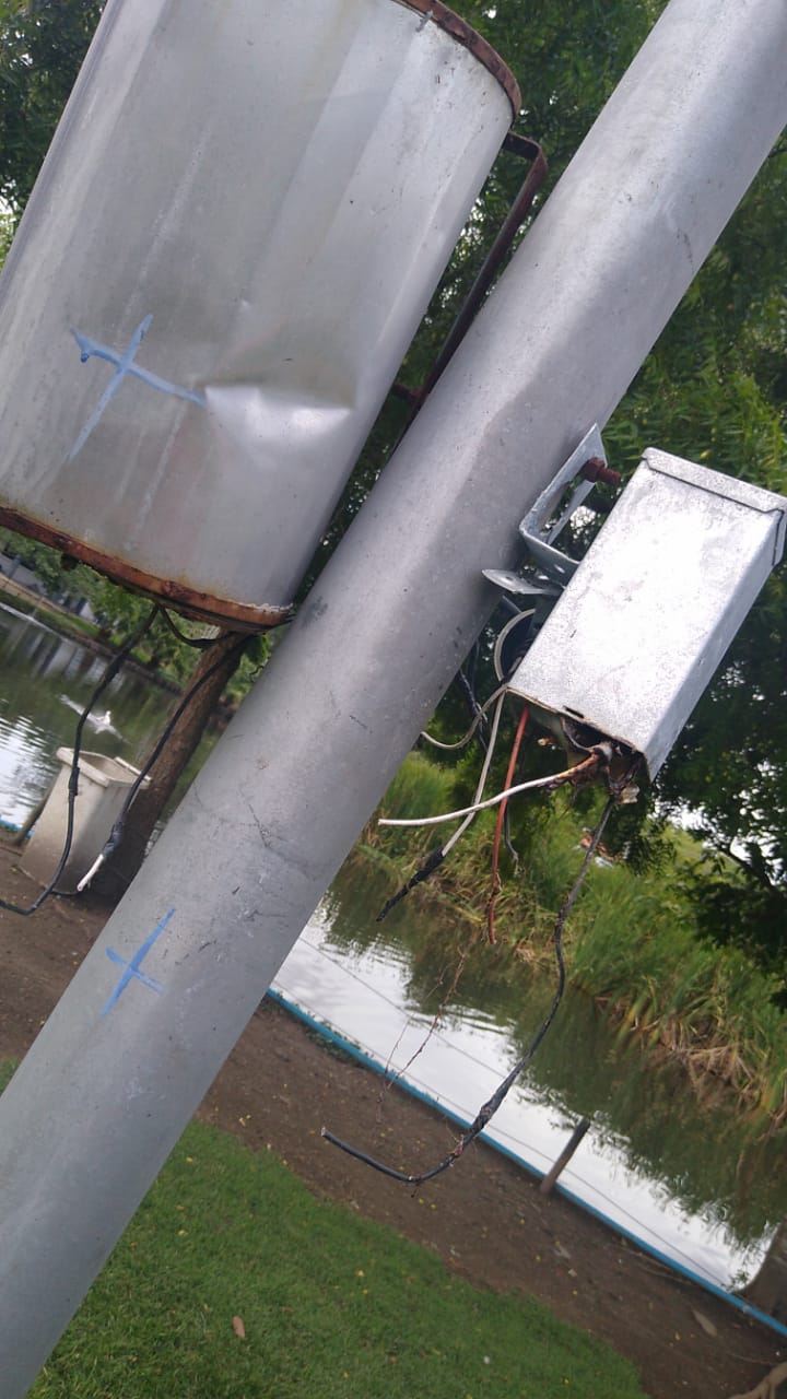 A parte elétrica está submersa em água, todas as caixas estão cheias d’agua, o que tem corroído os fios elétricos e danificado as torres de iluminação. Observa-se que os fios estão enterrados diretamente na areia sem tubos de proteção. As caixas de distribuição são de cimento e tijolos no chão úmido o que possibilita o encharco das caixas. Essa semana uma equipe da prefeitura foi acionada urgente, pois ao pé da caixa central estava fumaçando (a fumaça saia debaixo da terra), os profissionais da secretaria de serviços público constataram que a fumaça saia do chão onde os fios (maranhado) estavam danificados alguns partidos, o que estava causando curto circuito e por pouco não causou um dano maior em toda rede, o que poderá acontecer a qualquer momento. Diversas torres de iluminação não funcionam dado aos desgastes dos fios que se encontram em situação deplorável. (Vejam as fotos).