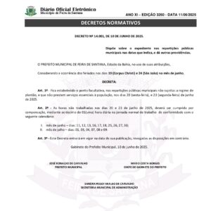 Foi publicado no Diário Oficial do Município de Feira de Santana, nesta quarta-feira (11), o Decreto nº 14.001/2025, que estabelece ponto facultativo nas repartições públicas municipais nos dias 20 (sexta-feira) e 23 (segunda-feira) de junho. A medida foi assinada pelo prefeito José Ronaldo de Carvalho e leva em consideração os feriados de Corpus Christi, celebrado no dia 19, e São João, comemorado no dia 24 de junho.