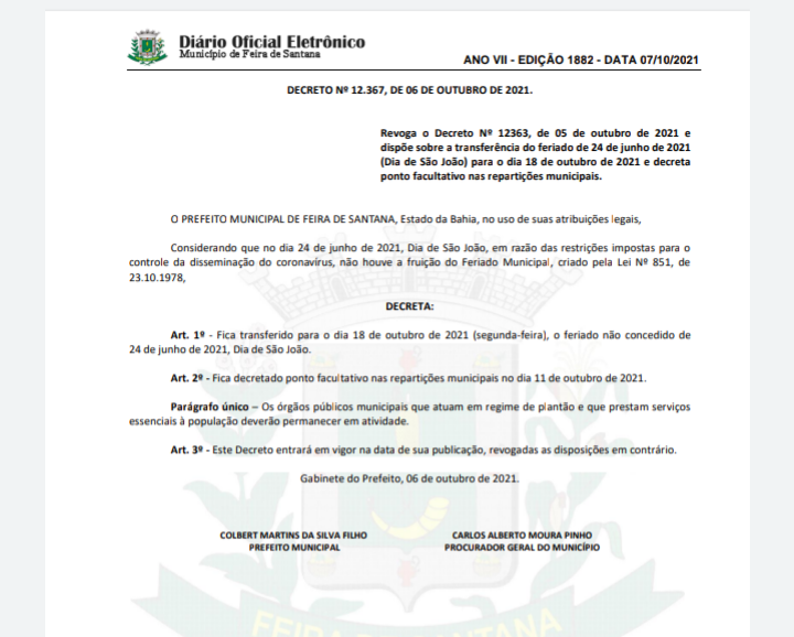 Após grande repercussão sobre o feriado do São João dado nas vésperas do feriado (11) do dia das crianças (12), o prefeito de Feira de Santana Colbert Martins MDB, revoga o Decreto.