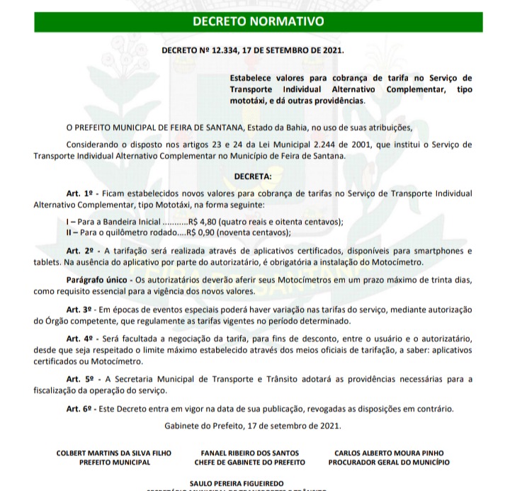 A nova tarifa para Mototaxi em Feira de Santana foi publicado neste sábado (18), no Diário Oficial do Município. O governo estabeleceu que a corrida seja tarifada com R$ 4,80 na largada e mais R$ 0,90 centavos a cada quilômetro rodado. A medida causa estranheza pois encarece ainda mais os serviços empurrado os passageiros para o aplicativo o que deixará os mototaxistas em dificuldade. Se sentar na moto já vai pagar R$ 4,80.